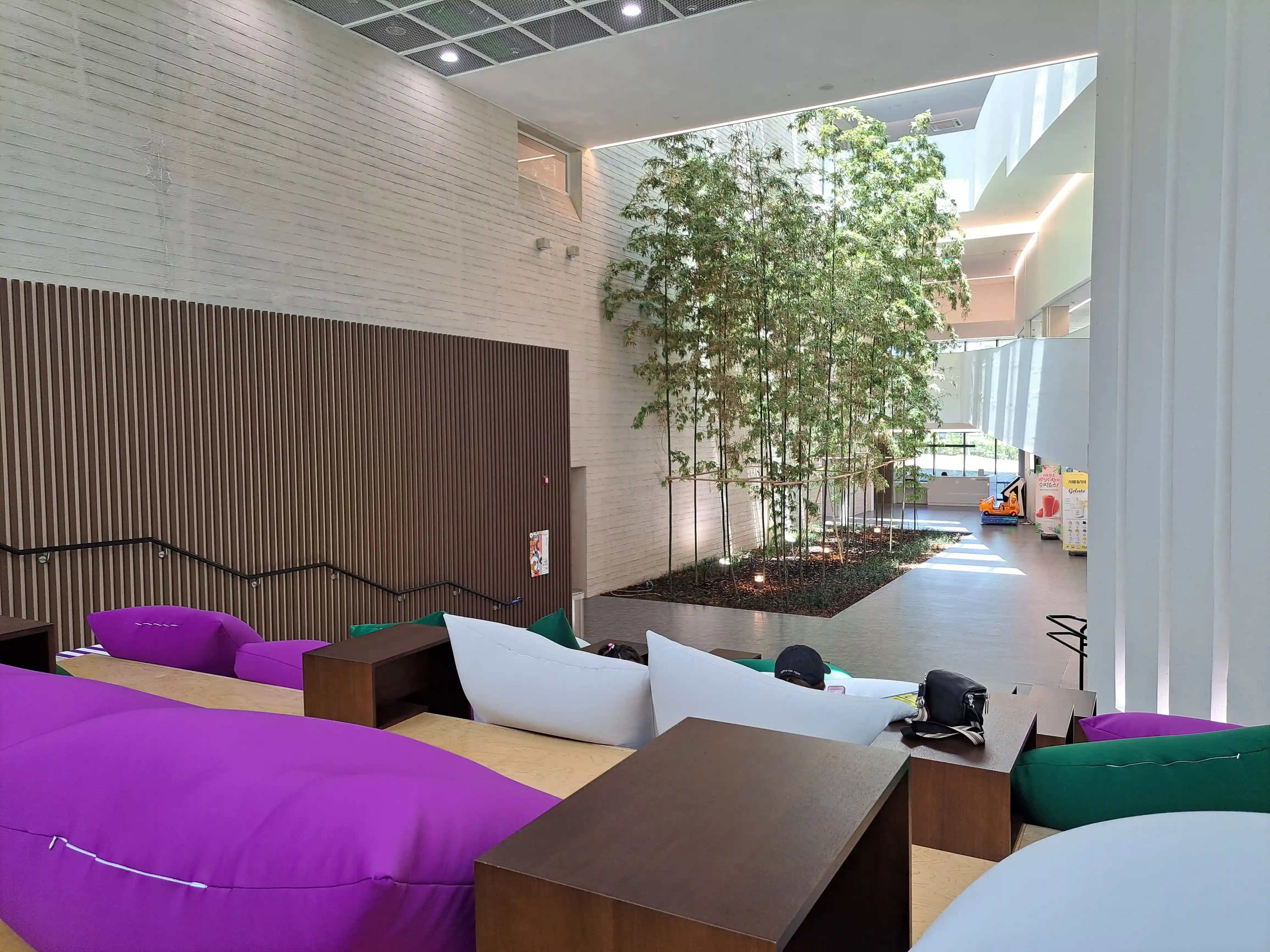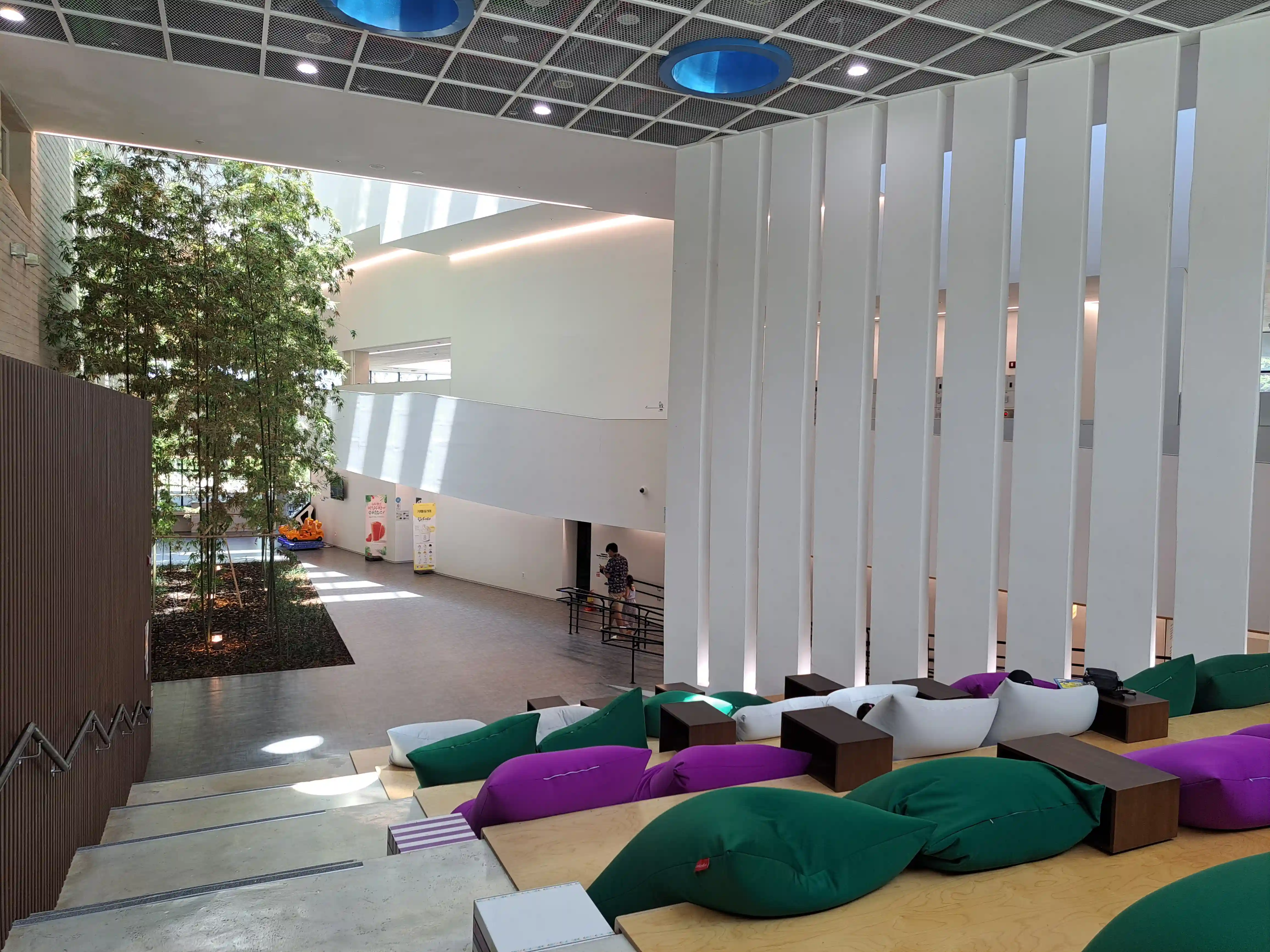 지하 1층은 방문객들을 위한 다양한 편의 시설로 가득합니다. 가장 먼저 눈에 띄는 것은 힐링숲정원 분위기의 휴식 공간입니다. 푹신한 빈백에 기대어 독서를 즐길 수 있으며, 유아 및 아이들을 위한 다양한 책들도 구비되어 있어 가족 단위 방문객에게 좋습니다. 또한, 간단한 식사와 음료를 즐길 수 있는 카페테리아가 있어 편리합니다.