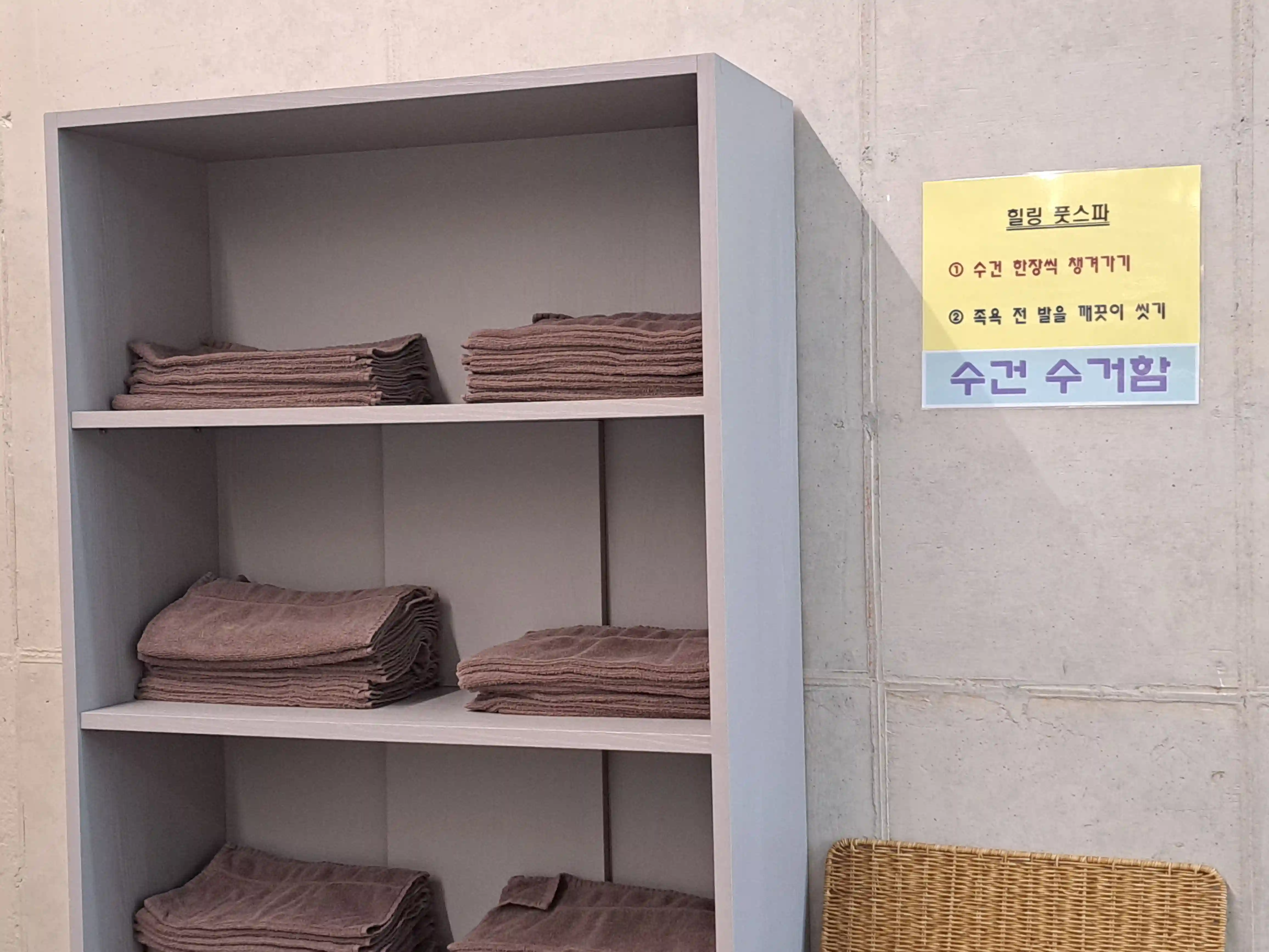 힐링의 정점은 힐링풋스파입니다. 따뜻한 물에 발을 담그고 앉아 창밖의 풍경을 바라보면 진정한 영동 레인보우힐링센터의 매력을 느낄 수 있습니다. 발수건이 깨끗하게 구비되어 있어 따로 챙길 필요가 없습니다.