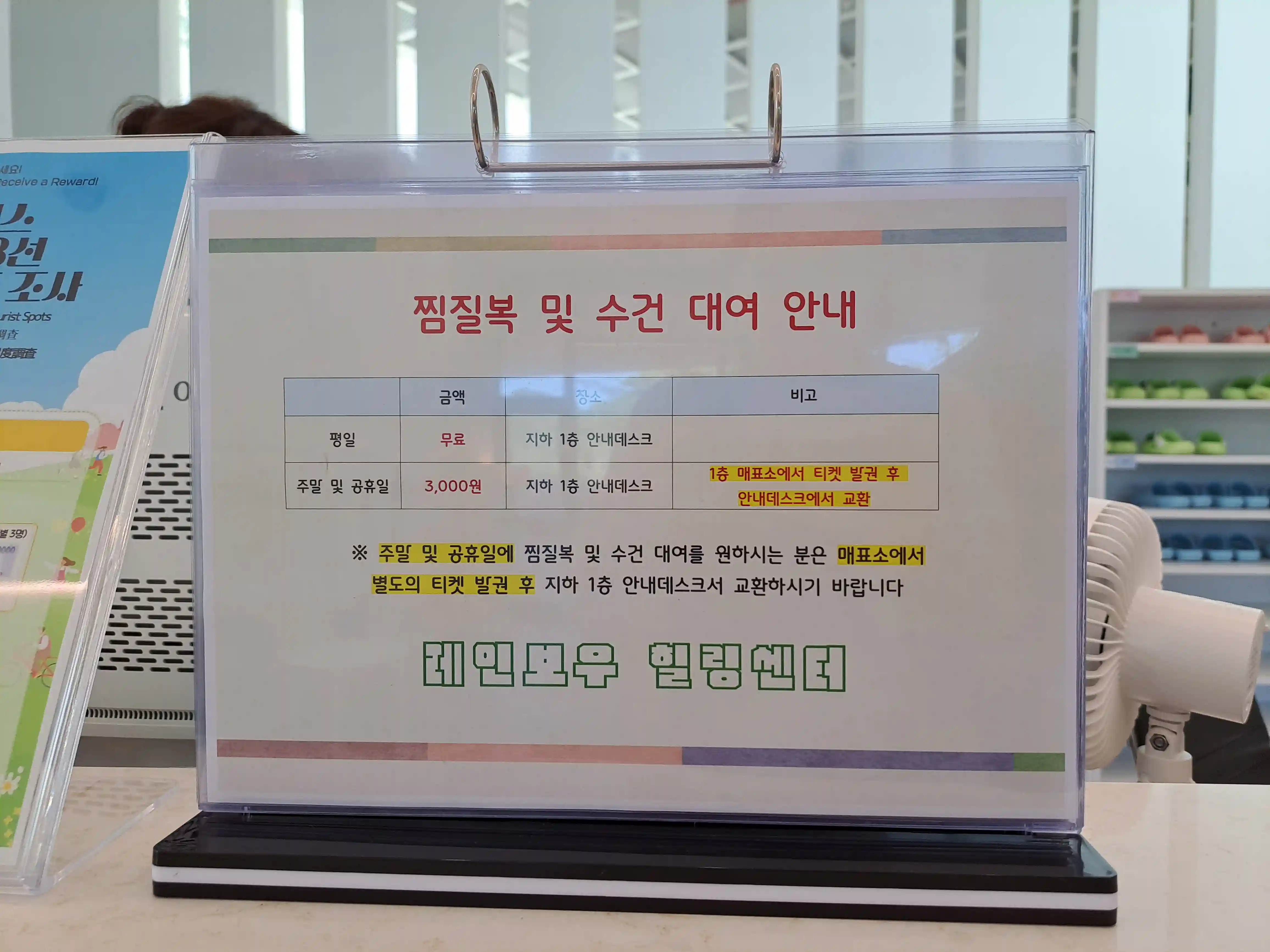 - 찜질복 및 수건 대여: 평일은 무료, 주말 및 공휴일은 3,000원입니다.