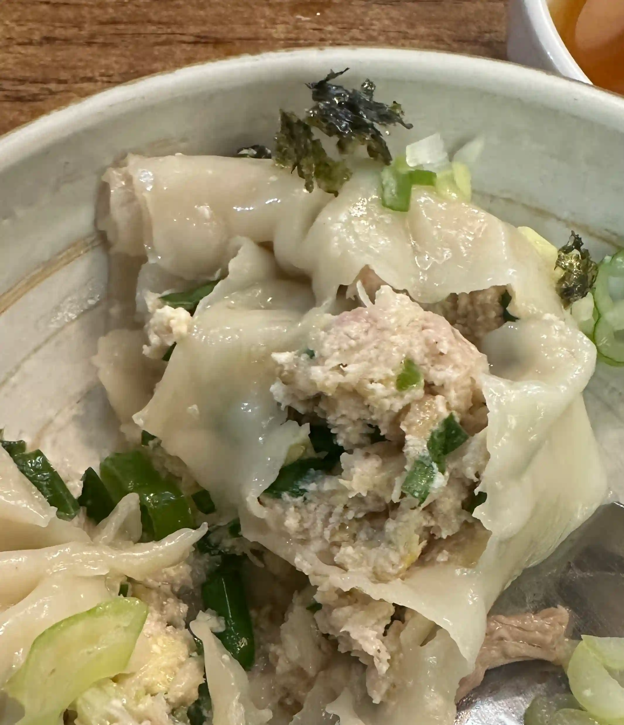 一碗里有4个饺子。上面放了牛肉丝、紫菜丝和一些葱花。总体的味道呢?很清淡。几乎没有调味,没有味精的味道。我个人非常喜欢这种味道。去饭店吃,总觉得调味品放太多了,而这种清淡的口味只有在真正的美食店才能尝到。汤头非常清爽干净,喝下去胃很舒服。里面的肉馅也很饱满。