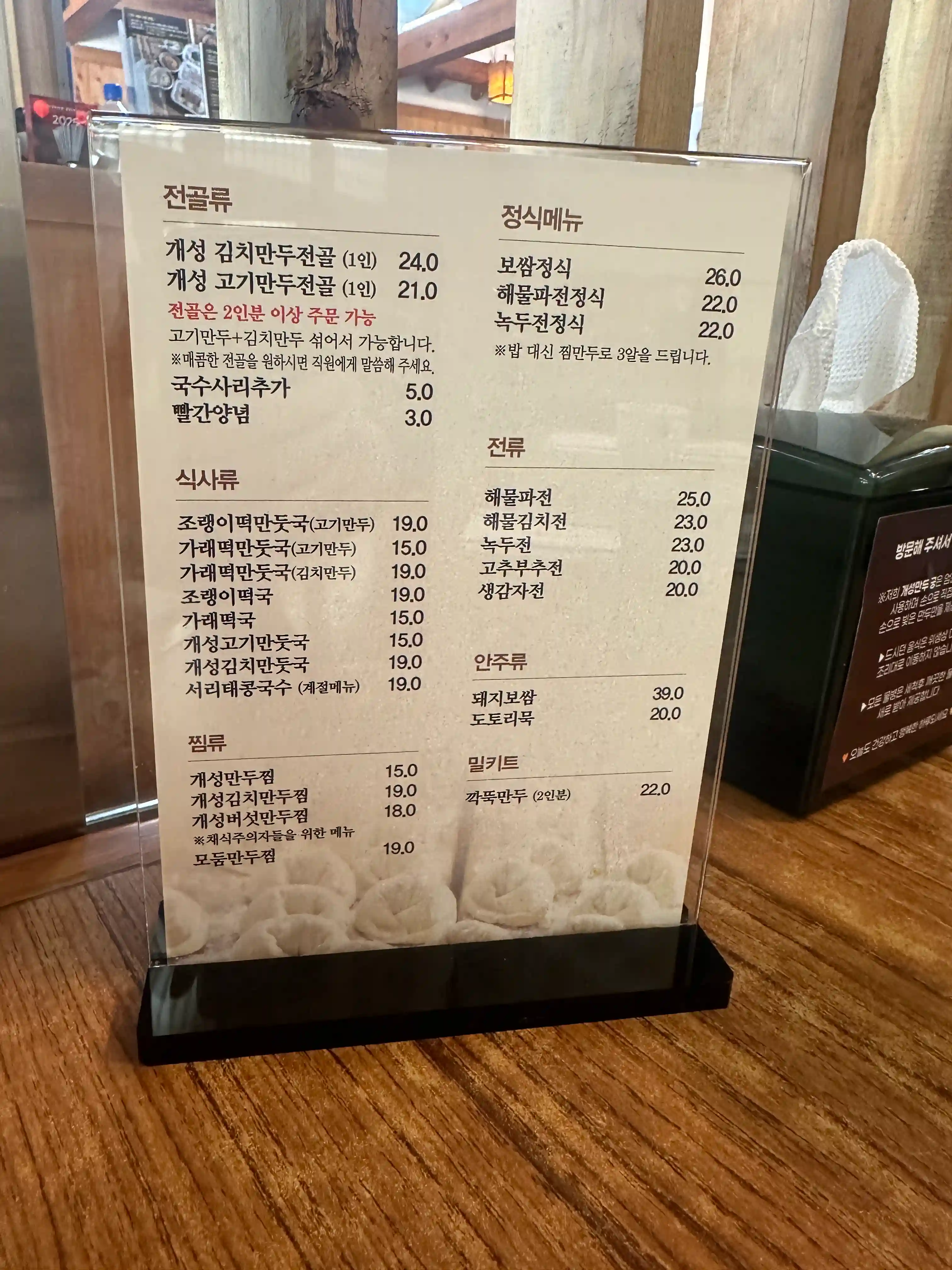 | 火锅类 | 开城泡菜饺子火锅 (1人份) | 24,000 | 需2人份以上起订,可混合肉饺子和泡菜饺子,可要求加辣 |
